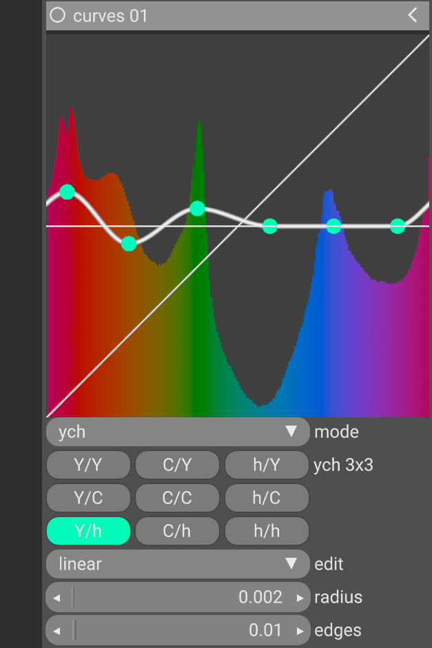 - curves per-channel rgb/luminance or 3x3 combinations of ych curves